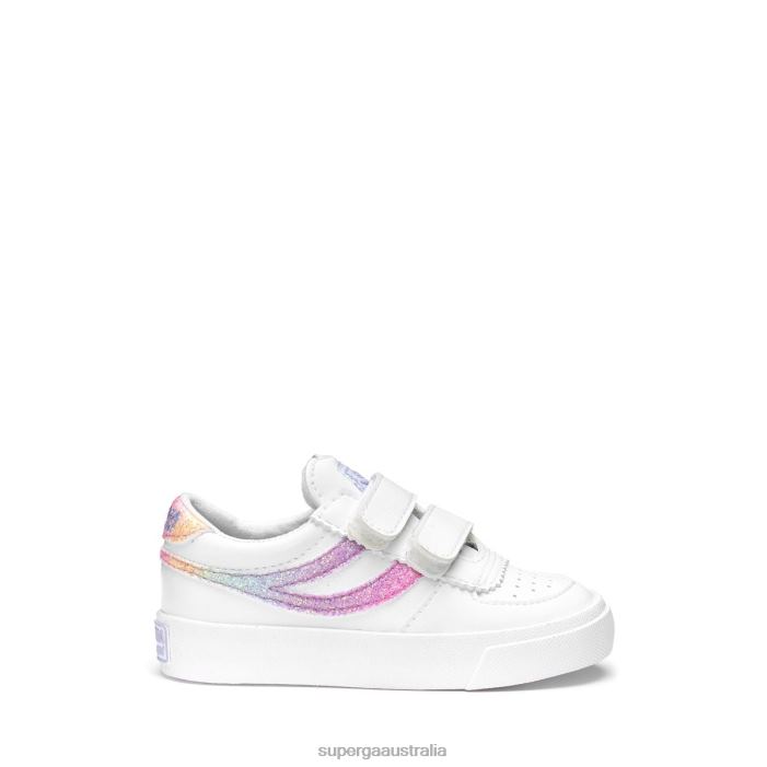 90s basket inspired style for kids, a take down from our adults. Reinvented with an upper in vegan leather and details such as our signature swallow tail logo in mirco rainbow glitter stitched on both sides. A 2 strap velcro closure makes an ease of wear.